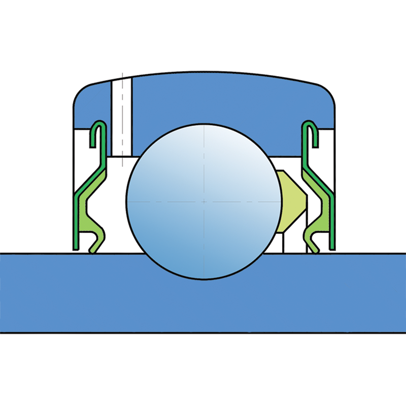 Single lip seal with the labyrinth between the sheet part and the rubber lip which conducts the contact sealing. The friction and speeds are the same as with RS but provides much better protection against the rough impurity particles. This is very good sealing system: the sheet part protects the seal from the soil, dust and rough particles. At the same time makes the labyrinth with the rubber part. The rubber part provides contact sealing which prevents penetration of finer impurities, water, moisture, steam etc. Suitable for neutral conditions because of the presence of the foreign materials. It is used with the Y bearing (standard) and deep groove ball bearings.