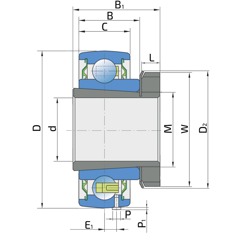 | E1 | Distance from raceway center to the stopping pin | 12 mm |